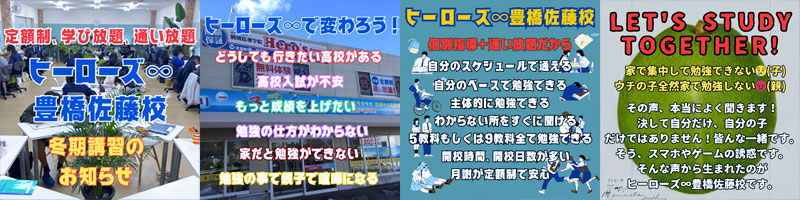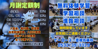 中学生と小学生を対象としたヒーローズ∞(エイト)豊橋佐藤校は、「通い放題・学び放題」だから自分のスケジュール・学習ペースでたっぷり勉強できます。どんな簡単な内容でも、どんな難問でもしっかり納得できるまで指導致します。12月・冬休みを利用してジャンプアップを目指しているあなた! 一緒に頑張りましょう。詳しくは、お電話・DMにてお問い合せください。