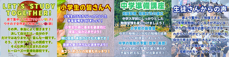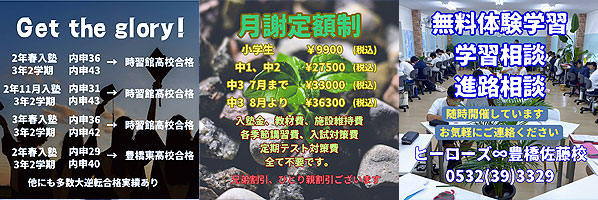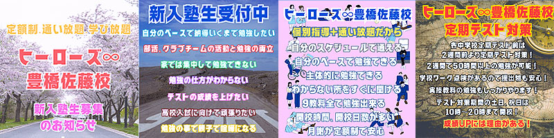 中学生と小学生を対象としたヒーローズ∞(エイト)豊橋佐藤校は、「通い放題・学び放題」だから自分のスケジュール・学習ペースでたっぷり勉強できます。どんな簡単な内容でも、どんな難問でもしっかり納得できるまで指導致します。新学年からのスタートダッシュを決めるために一緒に頑張りましょう。詳しくは、お電話にてお問い合せください。0532-39-3329